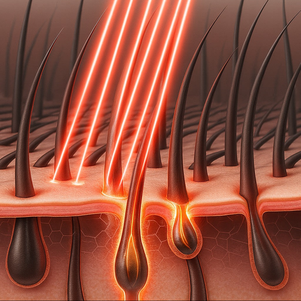 Red light at 650nm penetrates the scalp to stimulate hair follicles and increase blood flow. Combined with gentle vibration massage, it wakes up dormant roots naturally.